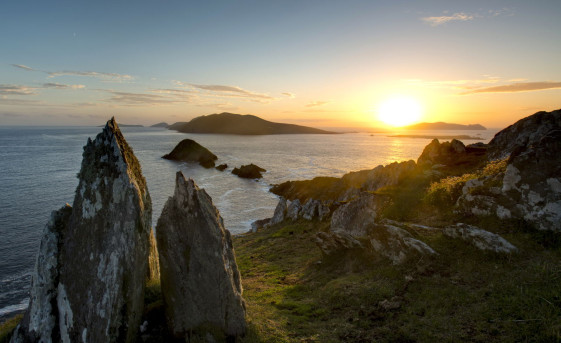 Commencez votre périple avec le col de Conor, le plus haut du pays, et régalez-vous des panoramas extraordinaires : au sud, le port de Dingle, et au nord, le mont Brandon. Poursuivez avec la Slea Head Drive, une route touristique dont les méandres vous mèneront à travers les paysages sauvages de toute beauté de la péninsule. Vous vous arrêterez en route pour admirer les vues à couper le souffle, par exemple sur l’archipel des Blasket Islands ou les trois rivières que l’on surnomme les trois sœurs (Three Sisters).